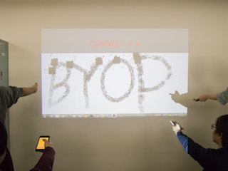 本研究の目的は,スマートフォンを用いて同時接続が可能なポインティング手法の実現である.既存のポインティング手法は,専用のデバイスが必要であったり,操作に制約が多かったりするなどの問題がある.そこで本研究では,スマートフォンのジャイロセンサを活用することにより,ユーザが専用の機器を用意する必要なく,自らのスマートフォンでポインティングが行える手法としてBYOP(Bring Your Own Pointer)を提案する.提案手法の活用例として,複数人で仮想キャンバスに共同で文字を描ける書道システムを試作した. |